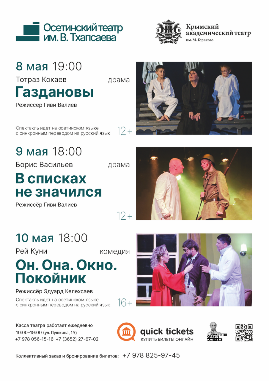 В рамках Года единства народов России, ко дню Победы, 8-10 мая 2026 года в Крымском академическом русском драматическом театре им. М. Горького (основная сцена, ул. Пушкина, 15, г. Симферополь) пройдут гастроли Северо–Осетинского государственного академического театра им. Владимира Тхапсаева.