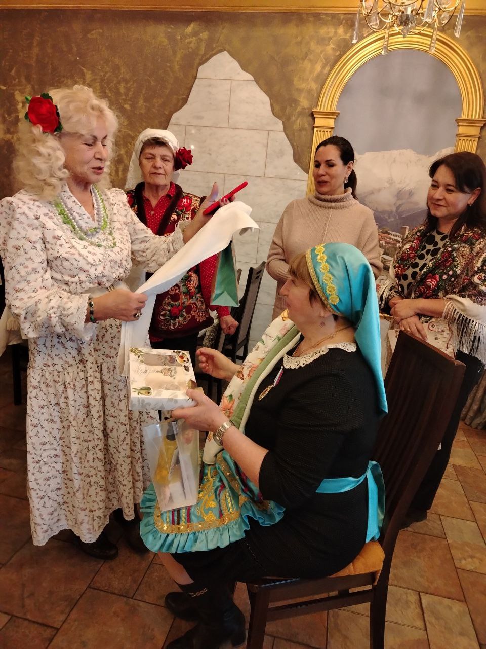 Согласно традиции, женщины омывали ей руки, одаривали подарками, благодарили за помощь. В знак особого уважения преподнесли каравай и домашнюю выпечку.