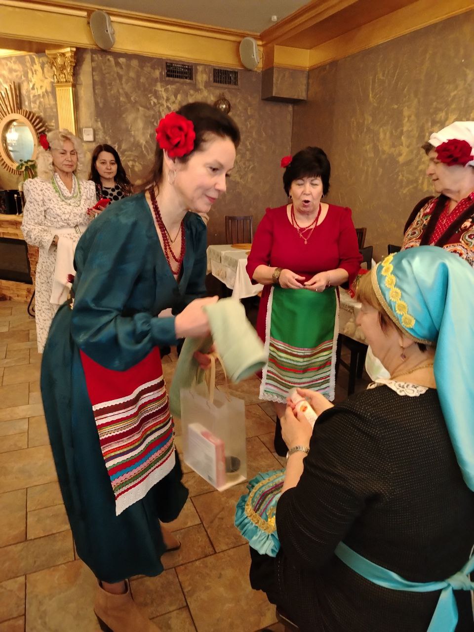 Участницы вечера делились опытом материнства, вспоминали своих матерей и бабушек. Приятный сюрприз подготовила для всех член Болгарского общества Мария Косякова, вручившая каждой участнице цветок «Женское счастье».
