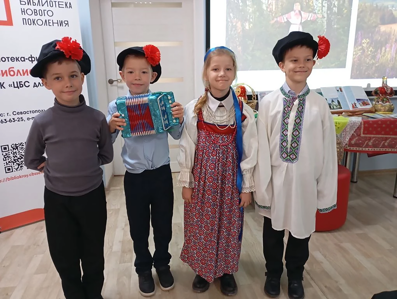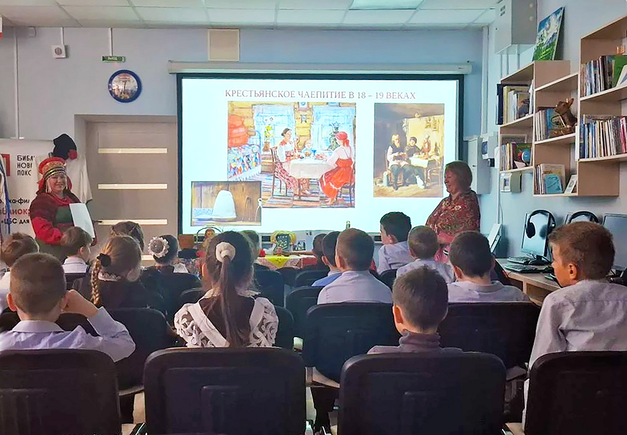 На тематическом мероприятии, подготовленном сотрудниками библиотеки и ведущими методистами Севастопольского городского национально-культурного центра Ириной Белой и Ольгой Кармановой, ученики 2-го класса школы № 25 узнали много нового и интересного о, казалось бы, хорошо известных символах русской культуры. Рассказ сопровождался красочной презентацией, выставкой предметов быта и декоративно-прикладного творчества, викториной, русскими песнями и частушками в исполнении члена Общества русской культуры Ольги Кармановой.