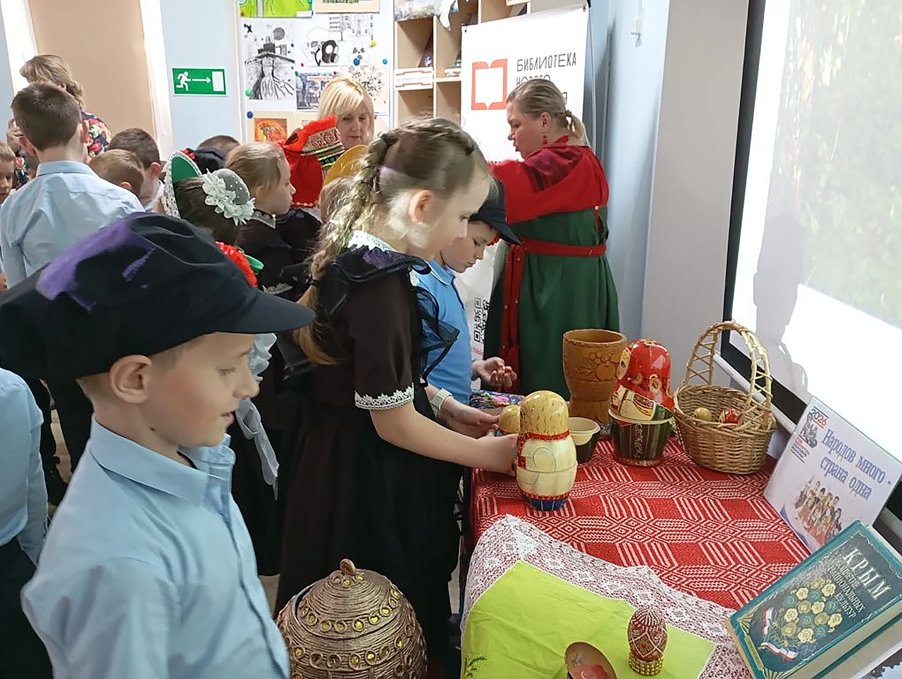 Встреча закончилась знакомством ребят с замечательной книжной выставкой «Наш общий дом – Россия», а также с музыкальными инструментами, предметами быта и примеркой русских народных костюмов.